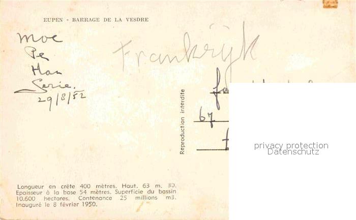 72660454 carte postale Eupen Barrage de la Vesdre postalisch gelaufen Erhaltung siehe scans [AndreD76] KatCode: 11070063000157