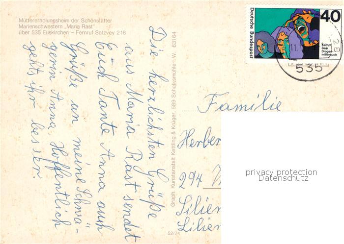 72940800 alte Postkarte Euskirchen Muettererholungsheim Schoenstaetter Marienschwestern Maria Rast postalisch gelaufen Erhaltung siehe scans [KathaD81] KatCode: 11110005366016