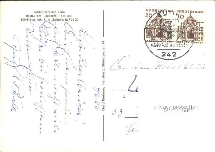 72255547 alte Postkarte Eutin Schleswig-Holstein Restaurant Seecafe Festsaal Schlossterrassen Naturpark Holsteinische Schweiz postalisch gelaufen Erhaltung siehe scans KatCode: 11110001055012