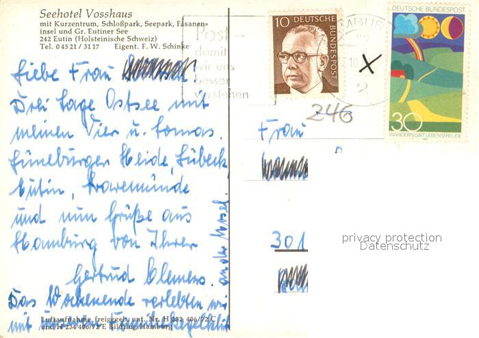 73703707 Eutin Schleswig-Holstein Seehotel Vosshaus Kurzentrum Schlosspark Seepark Fasaneninsel Eutiner See postalisch gelaufen Fliegeraufnahme Erhaltung siehe scans [FriedD77] Fliegeraufnahme alte Postkarte Frie Katcode 11110001055012