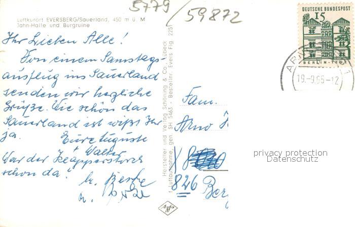 73705769 alte Postkarte Eversberg Jahnhalle und Burgruine Fliegeraufnahme postalisch gelaufen Erhaltung siehe scans [WerneD78] KatCode: 11110005958032