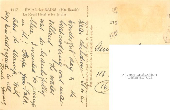 13772472 Evian-les-Bains 74 Le Royal Hotel et les Jardins postalisch gelaufen Erhaltung siehe scans [WerneD78] carte postale Wern Katcode 11170074474119