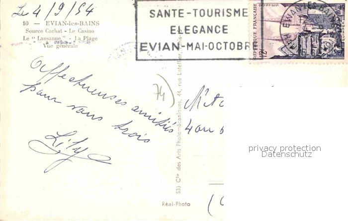 12706738 carte postale Evian-les-Bains Haute Savoie Source Cachat Casino Plage postalisch gelaufen Erhaltung siehe scans [LiesaD40] KatCode: 11170074474119
