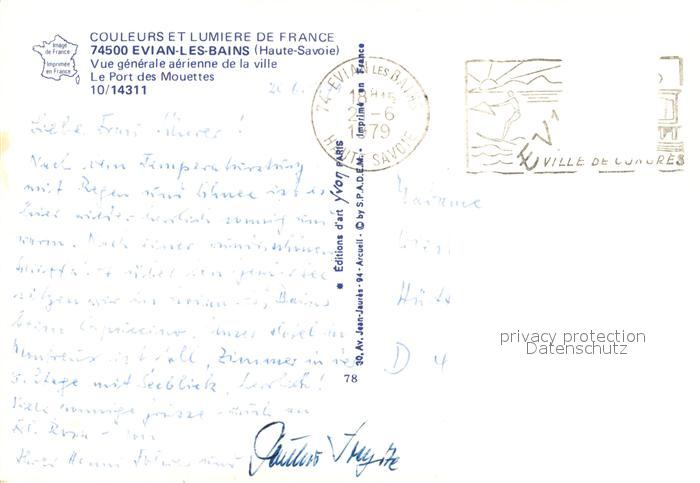 13265037 carte postale Evian-les-Bains Haute Savoie Vue generale aerienne de la ville Le Port des Mouettes postalisch gelaufen Erhaltung siehe scans [WerneD78] KatCode: 11170074474119