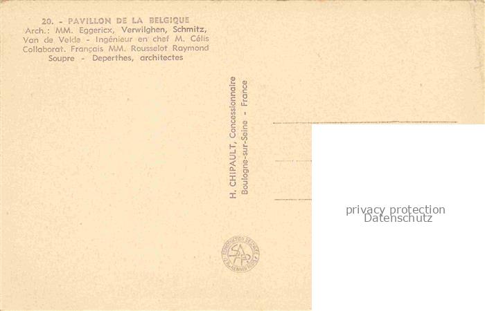 74014181 Exposition Internationale Paris 1937 Pavillon Belgique Arch Eggericx Verwilghen Schmitz postalisch nicht gelaufen Erhaltung siehe scans [SanaeD93] KatCode: 22100000000100