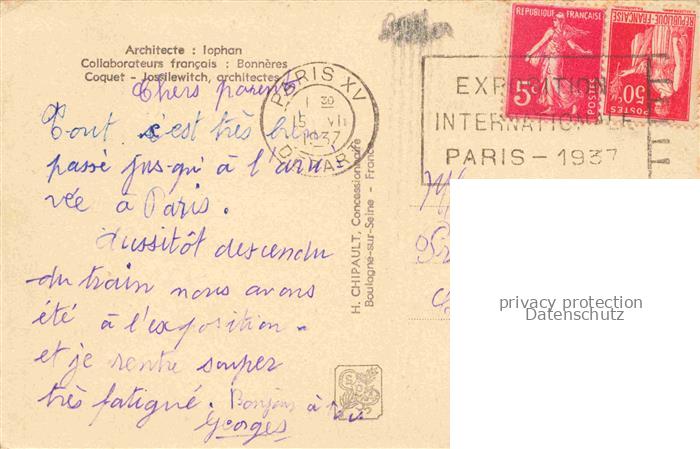 74014171 alte Postkarte Exposition Internationale Paris 1937 Pavillon L‘.R.S.S Lophan postalisch gelaufen Erhaltung siehe scans [SanaeD93] KatCode: 22100000000100