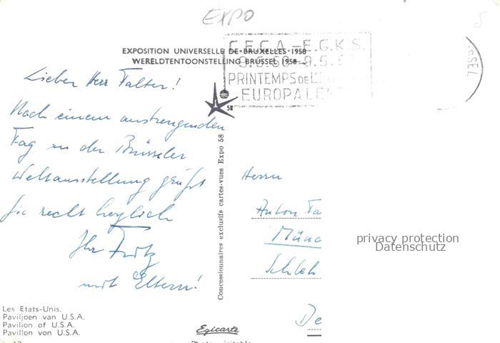 74052931 alte Postkarte Exposition Universelle Bruxelles 1958 Pavillon von USA postalisch gelaufen Erhaltung siehe scans [IrynaD87] KatCode: 22100000000100