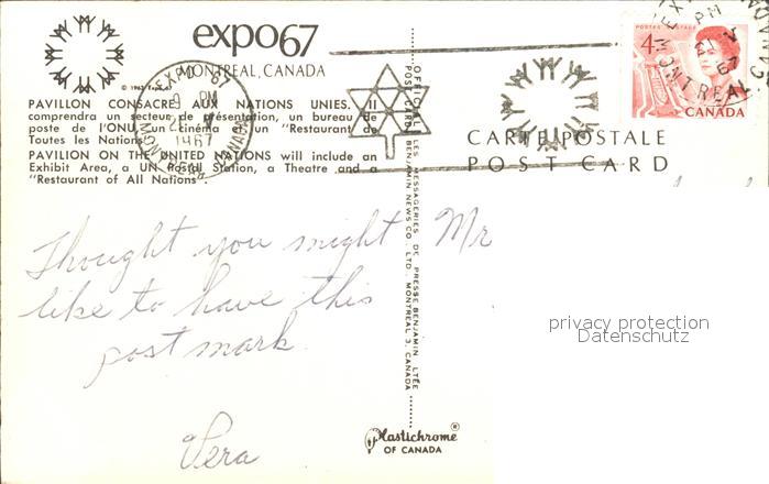 alte Postkarte Expositions Expo67 Montreal Canada Pavillon Consacre aux Nations Unies postalisch gelaufen Erhaltung siehe scans