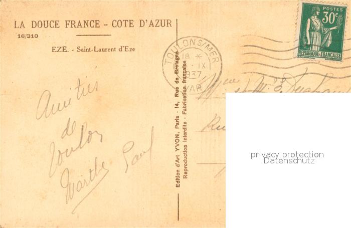 13605252 carte postale Eze-sur-Mer Saint Laurent d Eze postalisch gelaufen Erhaltung siehe scans [WerneD78] KatCode: 11170006206059