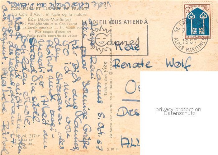 13745125 Eze-sur-Mer Vue generale et le Cap Ferrat Le Jardin exotique Vieille rue Rue coupee d’escaliers Petite ruelle couverte de voutes KatCode 11170006206059