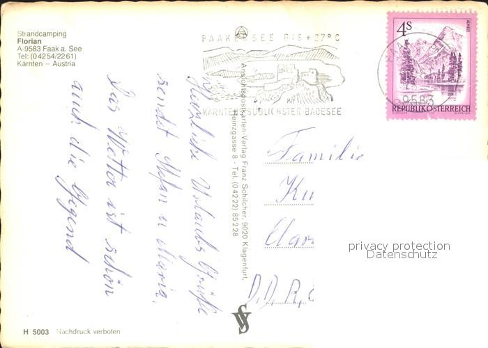 72037987 alte Postkarte Faak am See Finkenstein Strandcamping Florian Strand und Segelpartien Bungalow Spielplatz postalisch gelaufen KatCode: 11390211020711