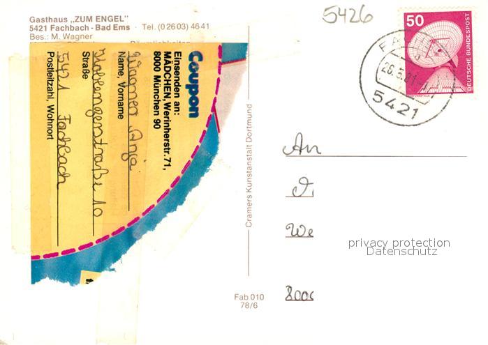 73086687 alte Postkarte Fachbach Gasthaus Zum Engel postalisch gelaufen Erhaltung siehe scans [NatalD47] KatCode: 11110007141041