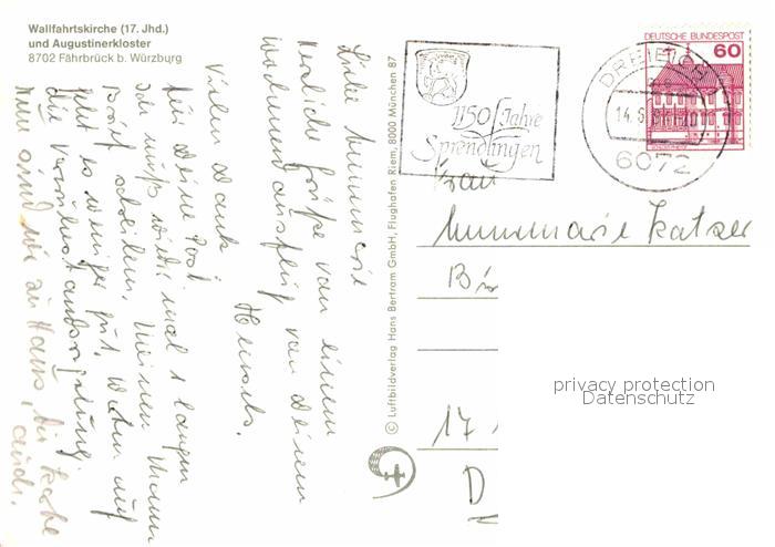 72826417 alte Postkarte Faehrbrueck Wuerzburg Wallfahrtskirche 17. Jhdt. Augustinerkloster Fliegeraufnahme postalisch gelaufen Erhaltung siehe scans [FriedD77] KatCode: 11110009679143