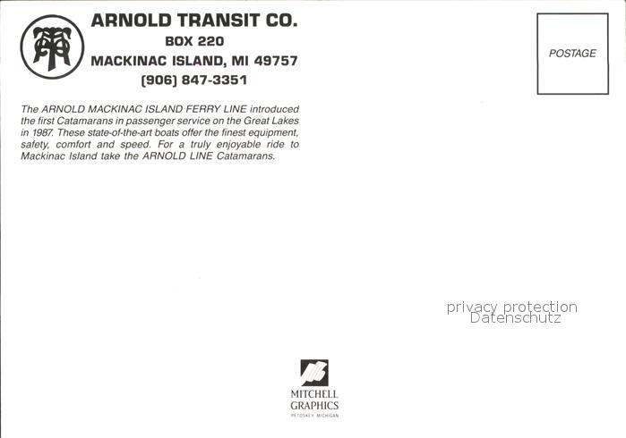 Faehre Ferry Bac Traghetto– Arnold Transit Co Mackinac Island postalisch nicht gelaufen Erhaltung siehe scans