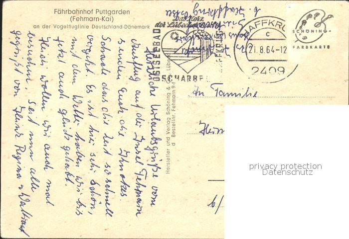 alte Postkarte Faehre Ferry Bac Traghetto– Faehrbahnhof Puttgarden Fehmarn-Kai postalisch gelaufen Erhaltung siehe scans