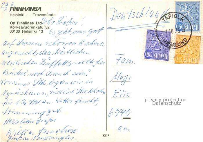 74051977 alte Postkarte Faehre Ferry Bac Traghetto– Finnhansa Helsinki Travemuende postalisch gelaufen Erhaltung siehe scans [IrynaD87] KatCode: 22480000000200