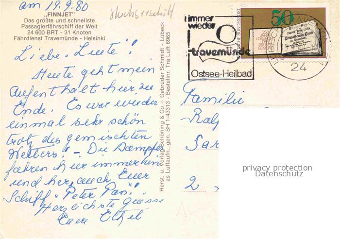 74051996 alte Postkarte Faehre Ferry Bac Traghetto– Finnjet 24600 BRT Travemuende Helsinki postalisch gelaufen Erhaltung siehe scans [IrynaD87] KatCode: 22480000000200