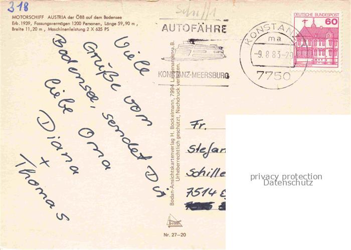 74052154 alte Postkarte Faehre Ferry Bac Traghetto– Motorschiff Austria oeBB Bodensee Meersburg Konstanz Staad postalisch gelaufen Erhaltung siehe scans [IrynaD87] KatCode: 22480000000200
