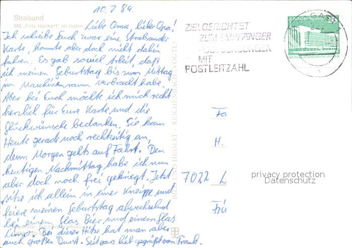 alte Postkarte Faehre Ferry Bac Traghetto– MS Fritz Heckert Hafen Stralsund postalisch gelaufen Erhaltung siehe scans