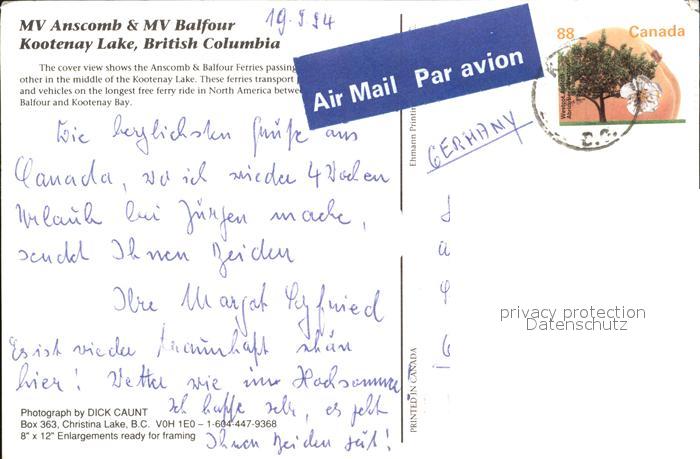 alte Postkarte Faehre Ferry Bac Traghetto– MV Anscomb MV Balfour Kootenay Lake British Columbia postalisch gelaufen Erhaltung siehe scans