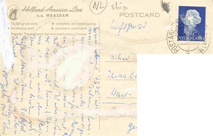 74032469 alte Postkarte Faehre Ferry Bac Traghetto– s.s. Maasdam Holland America Line postalisch gelaufen Erhaltung siehe scans [IrynaD87] KatCode: 22480000000200
