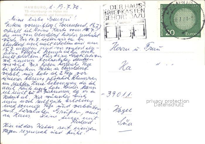 alte Postkarte Faehre Ferry Bac Traghetto– TS Hamburg Hafen Michaeliskirche Fernsehturm postalisch gelaufen Erhaltung siehe scans