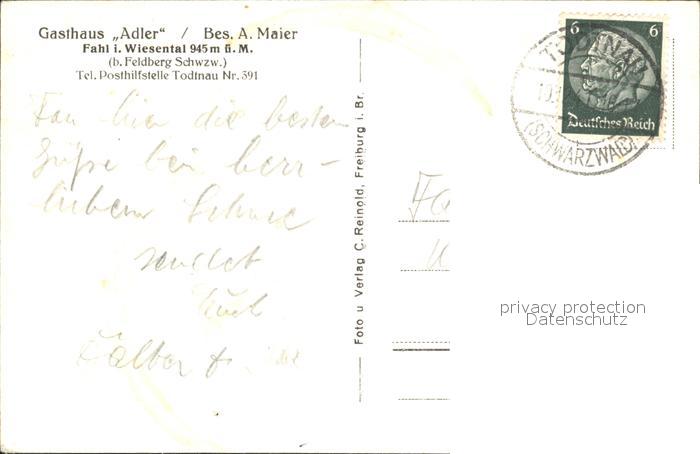 32185988 alte Postkarte Fahl Feldberg Gasthaus Adler postalisch gelaufen Erhaltung siehe scans KatCode: 11110008336087