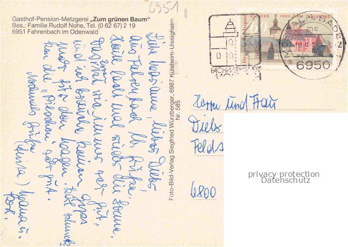 74048248 alte Postkarte Fahrenbach Baden BW Gasthof Pension Zum gruenen Baum Gastraum Brunnen postalisch gelaufen Erhaltung siehe scans [FriedD77] KatCode: 11110008225024
