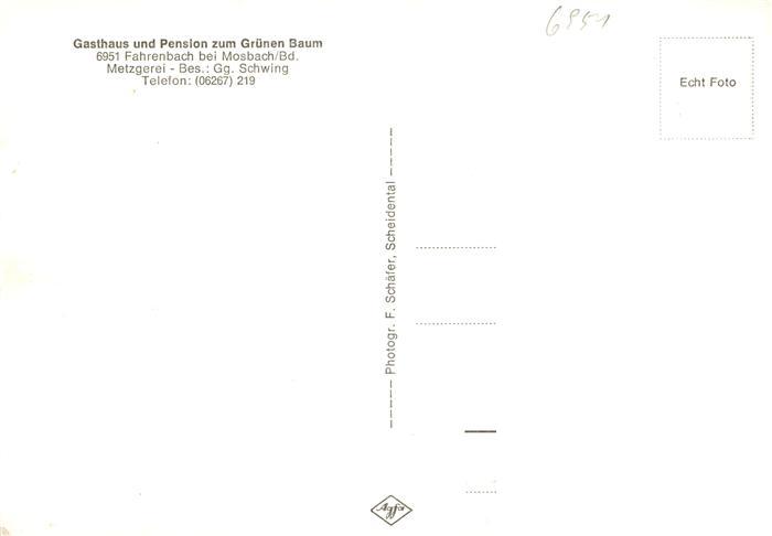 73878682 Fahrenbach Odenwald Gasthaus Pension zum gruenen Baum Gaststube Dampflokomotive Waldhuette postalisch nicht gelaufen Erhaltung siehe scans [FriedD77] KatCode: 11110006431007