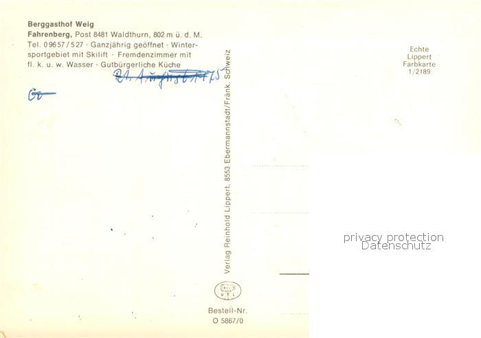 73654694 Fahrenberg Oberpfalz Berggasthof Weig Restaurant Kirche postalisch nicht gelaufen Erhaltung siehe scans [FriedD77] KatCode: 11110009374165