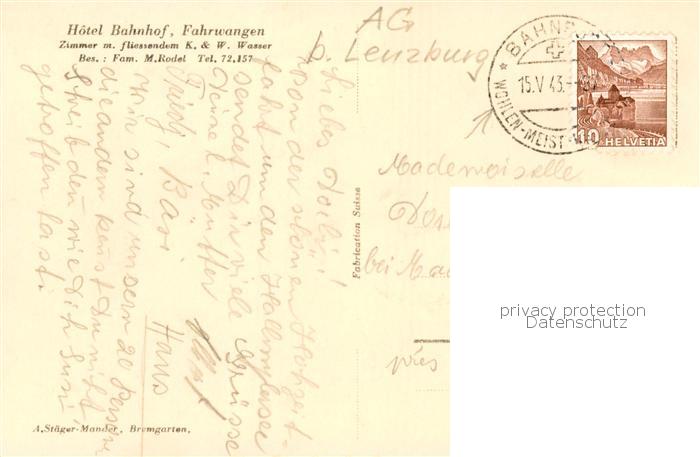 13797917 alte Postkarte Fahrwangen AG Hotel Bahnhof Kuenstlerkarte postalisch gelaufen Erhaltung siehe scans [FriedD77] KatCode: 11470010035318