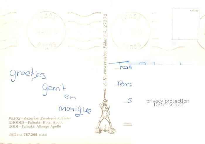 old postcard Faliraki Rhodos Hotel Apollo postalisch gelaufen Erhaltung siehe scans [WerneD78]