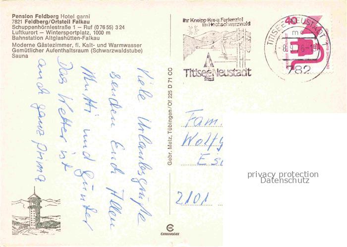 74043510 alte Postkarte Falkau Altglashuetten Feldberg BW Pension Feldberg Hotel garni Gastraum Terrasse Panorama Windgfaellweiher Schwarzwald postalisch gelaufen Erhaltung siehe scans [FriedD77] KatCode: 11110008315037