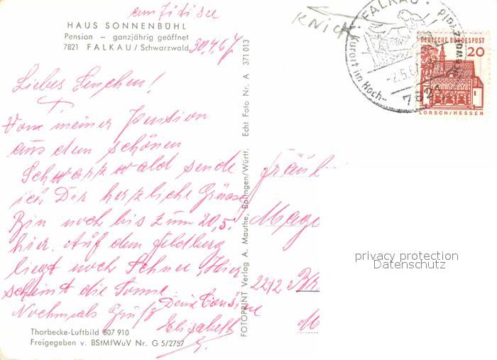 72688020 alte Postkarte Falkau Pension Haus Sonnenbuehl Fliegeraufnahme postalisch gelaufen Erhaltung siehe scans [FriedD77] KatCode: 11110008315037