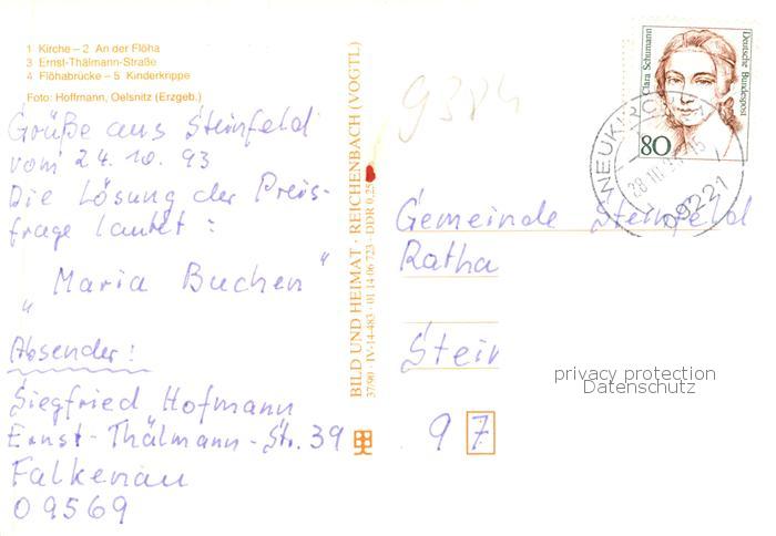 73873951 alte Postkarte Falkenau Sachsen Kirche An der Floeha Ernst Thaelmann Strasse Floehabruecke Kinderkrippe postalisch gelaufen Erhaltung siehe scans [WerneD78] KatCode: 11110014177110