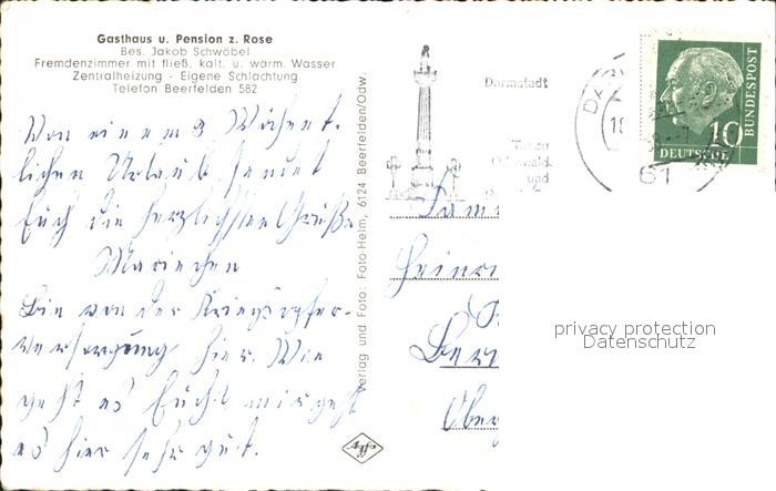 72102175 alte Postkarte Falkengesaess Odenwald Panorama Gastraum Gasthaus Pension zur Rose postalisch gelaufen Erhaltung siehe scans KatCode: 11110006437014