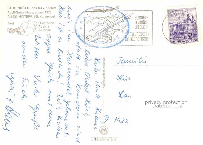 72752574 alte Postkarte Falkenhuette Adolf Sotier-Haus Hinterriss postalisch gelaufen Erhaltung siehe scans [LiesaD40] KatCode: 11390335070936