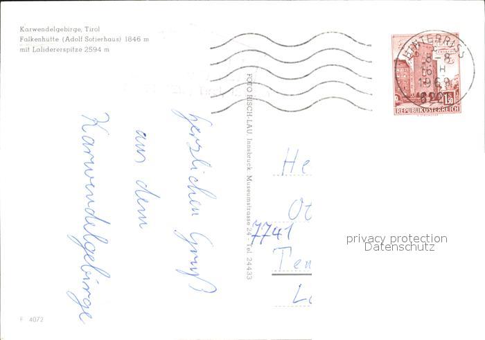 72485335 alte Postkarte Falkenhuette Karwendel mit Lalidererspitze postalisch gelaufen Erhaltung siehe scans KatCode: 11390335070936