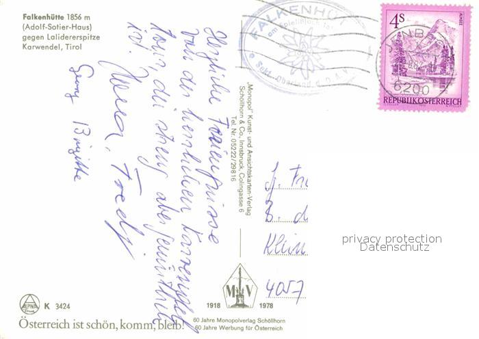 72649297 alte Postkarte Falkenhuette Schutzhaus gegen Lalidererspitze Karwendel postalisch gelaufen Erhaltung siehe scans [FriedD77] KatCode: 11390335070936