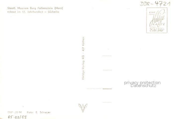 72984977 Falkenstein Harz Burg Falkenstein Suedseite postalisch nicht gelaufen Erhaltung siehe scans [WerneD78] KatCode: 11110015085110