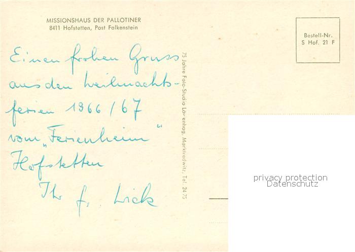73647662 Falkenstein Oberpfalz Missionshaus der Pallotiner Hofstetten postalisch nicht gelaufen Erhaltung siehe scans [WerneD78] KatCode: 11110009372125
