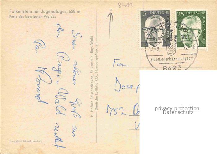 74049144 alte Postkarte Falkenstein Oberpfalz Panorama Jugendlager Perle des bayrischen Waldes postalisch gelaufen Fliegeraufnahme Erhaltung siehe scans [FriedD77] KatCode: 11110009372125