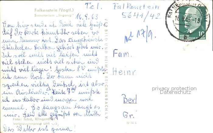 72152348 alte Postkarte Falkenstein Vogtland Sanatorium Irrgang postalisch gelaufen Erhaltung siehe scans KatCode: 11110014178170