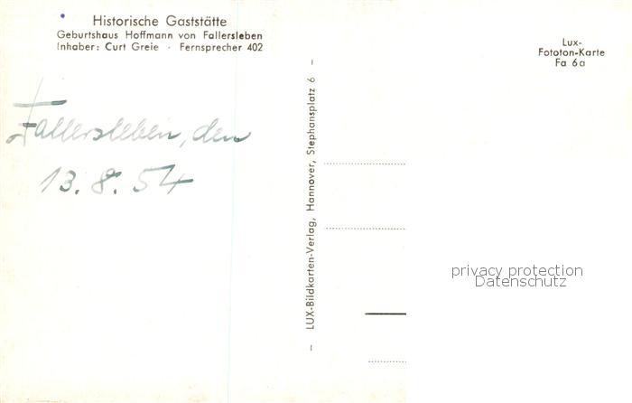 73816992 Fallersleben Historische Gaststaette Geburtshaus Hoffmann von Fallersleben postalisch nicht gelaufen Erhaltung siehe scans [FriedD77] KatCode: 11110003103000