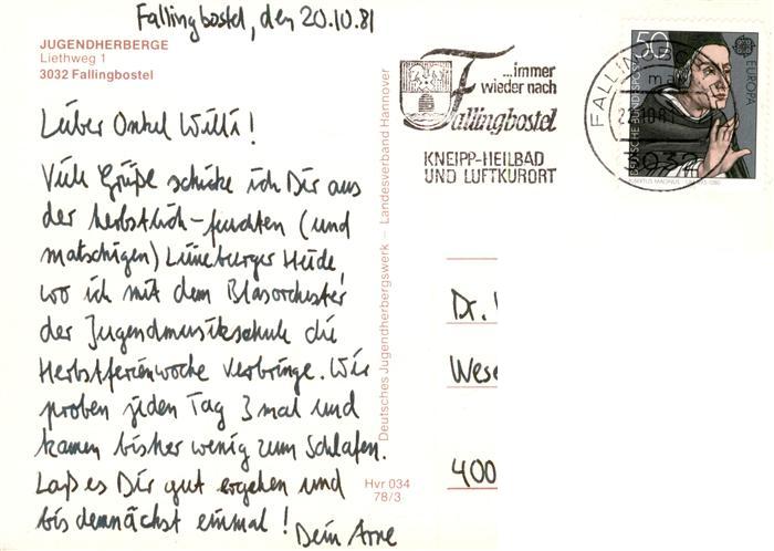 73879319 alte Postkarte Fallingbostel Bad Jugendherberge postalisch gelaufen Erhaltung siehe scans [FriedD77] KatCode: 11110003358008