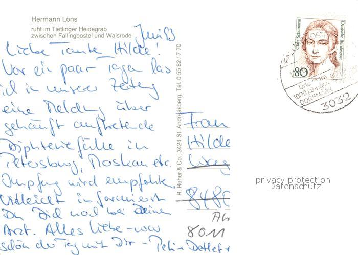 73095796 alte Postkarte Fallingbostel Hermann Loens Tietlinger Heidegrab postalisch gelaufen Erhaltung siehe scans [NatalD47] KatCode: 11110003358008