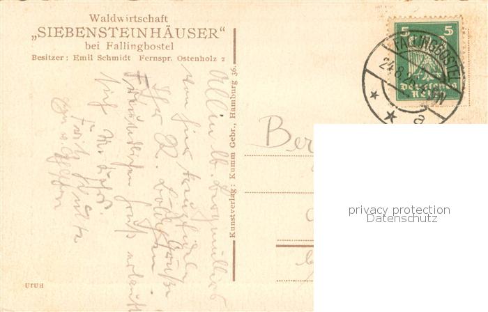 73768396 alte Postkarte Fallingbostel Waldwirtschaft Siebensteinhaeuser Aussenansicht postalisch gelaufen Erhaltung siehe scans [LiesaD40] KatCode: 11110003358008
