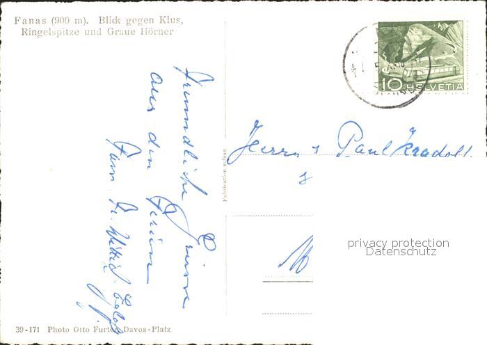11637752 alte Postkarte Fanas mit Klus Ringelspitze und Graue Hoerner postalisch gelaufen KatCode: 11470100350354
