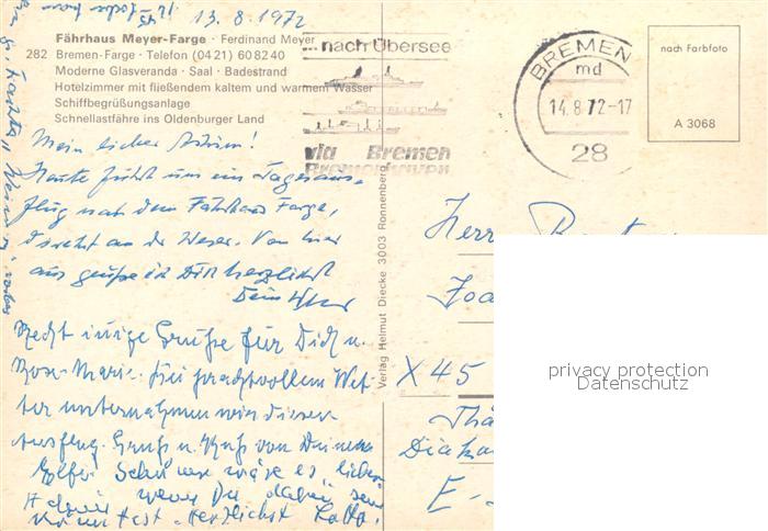 73569910 alte Postkarte Farge Faehrhaus Meyer Terrasse Dampfer postalisch gelaufen Erhaltung siehe scans [WerneD78] KatCode: 11110004011000