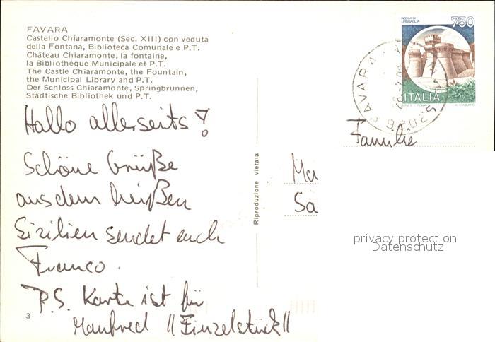 old postcard Favara Castello Chiaramonte sec. XIII Fontana Biblioteca Comunale Schloss Brunnen Bibliothek postalisch gelaufen Erhaltung siehe scans